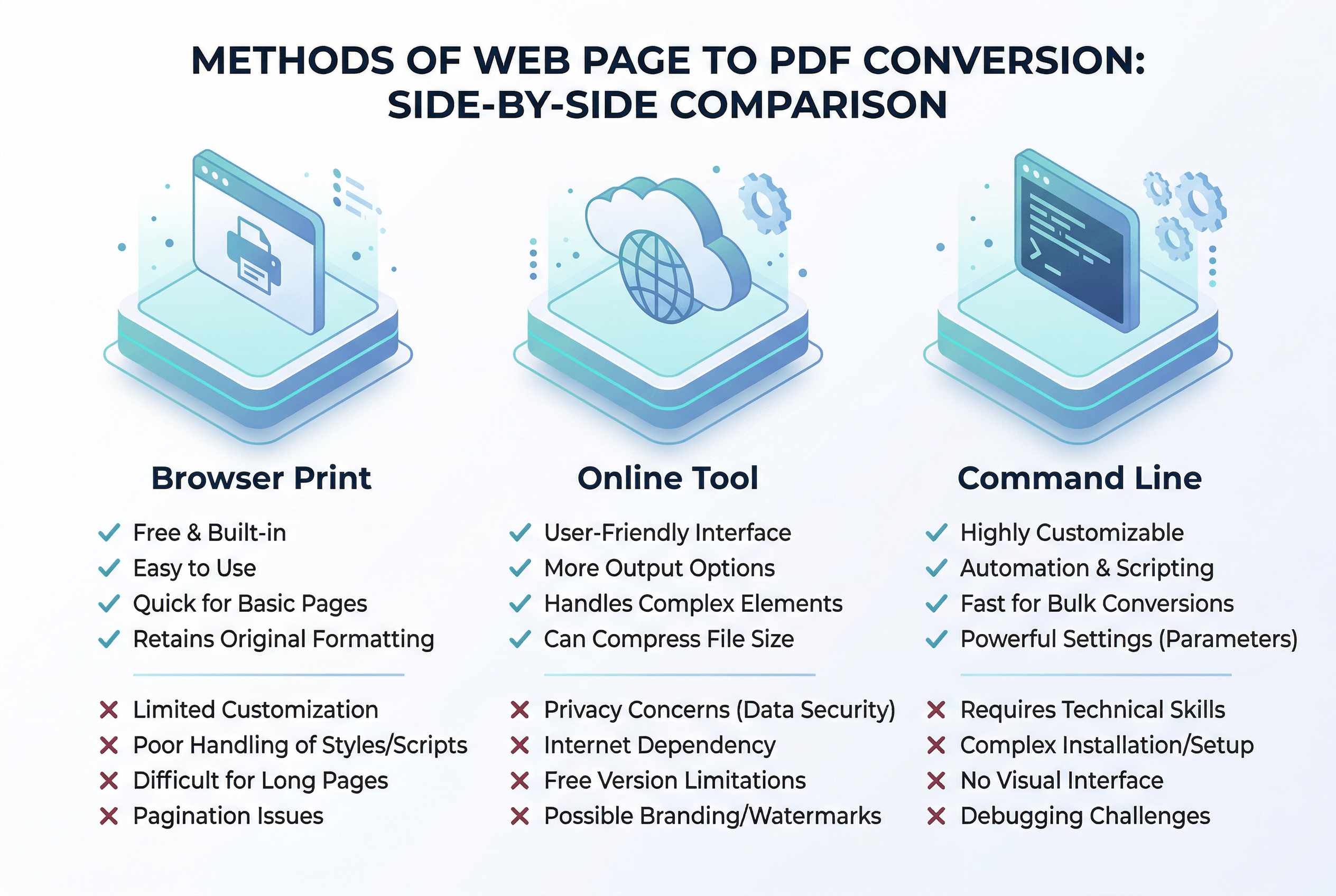 局限性:需要技术基础和开发环境。wkhtmltopdf 对 JavaScript 支持有限,重度动态页面可能渲染不完整。Puppeteer 需要 Node.js 环境,Chromium 二进制文件约 300MB。